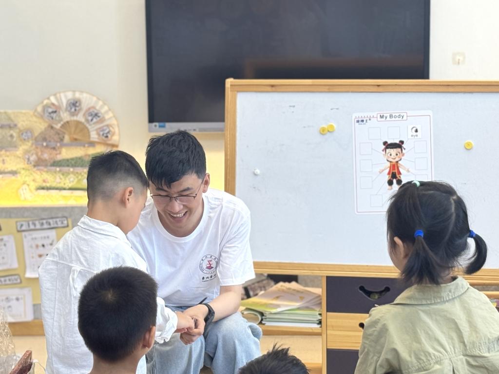 在我市全力推进儿童友好城市建设、喜迎“六一”国际儿童节之际,5月15日上午,校民革支部青年党员王欣超应椒江区心湖幼儿园(台州学院附属幼儿园)邀请,为孩子们带来了一堂别开生面的英语启蒙课。课程以英文歌曲为载体,结合互动游戏与身体律动,让孩子们在轻松愉悦的氛围中感受语言学习的魅力。